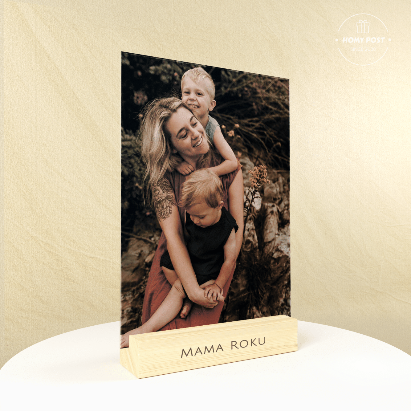 Dzięki eleganckiej, drewnianej podstawce wydruk można od razu postawić na półce. Gwarantujemy, że będzie to świetna niespodzianka dla Twojej Mamy!