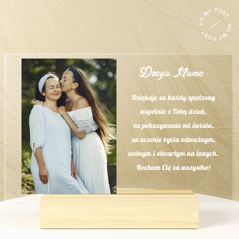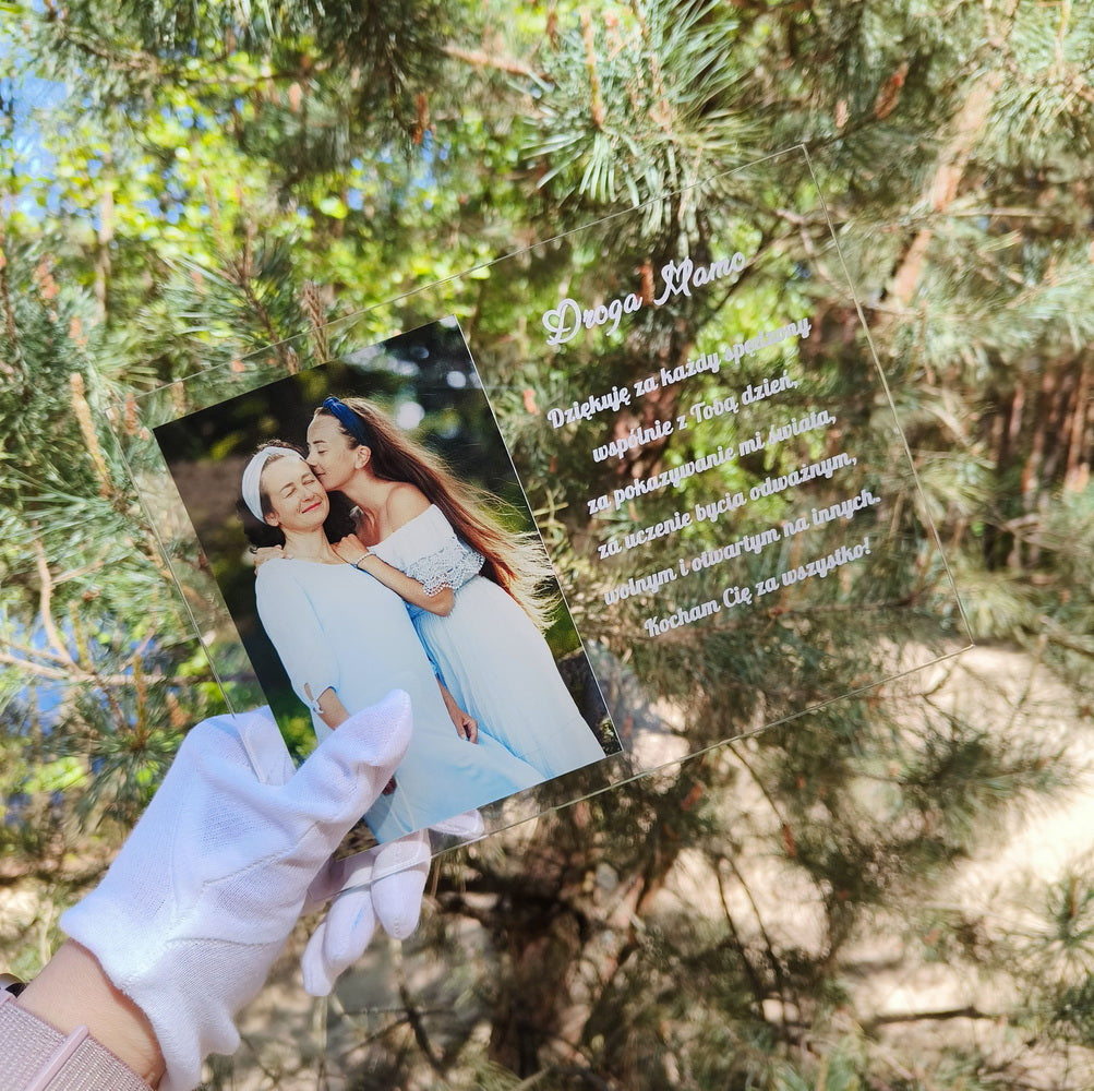 Wyjątkowa pamiątka Droga Mamo, która zachwyci obdarowaną osobę! Wydruk na bezbarwnym szkle akrylowym o grubości 4 mm to upominek na lata.